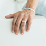 Das Model trägt den Quado, Ravelle, Hammered und Hiveiro - Ring.
