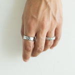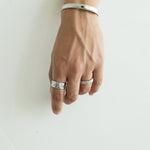 Das Model trägt den Hammered, Hiveiro und Quado - Ring, dazu das Rope 5mm Armband.